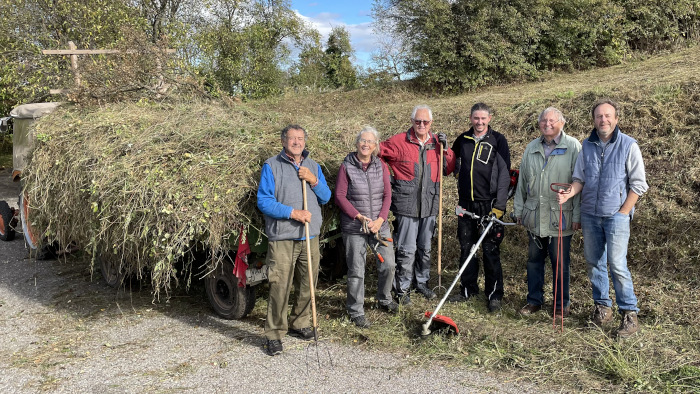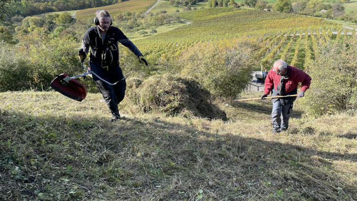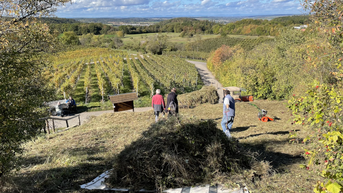 Am 21.10.2023 fand der alljährliche Landschaftspflegeeinsatz unserer Ortsgruppe am Augenberg statt. Nachdem es, wie auch schon im vergangenen Jahr, am Freitag zuvor noch geregnet hatte, waren wir froh, die wichtige Naturschutzarbeit bei schönem Herbstwetter durchführen zu können. Da die Mäharbeit zuvor aufgrund eines Krankheitsfalls nicht beendet werden konnte, wurde die restliche Fläche am Samstag gemäht. Parallel dazu schwangen wir die Rechen und Heugabeln. Die Helfer wurden wieder gut mit Getränken und Vesper versorgt. Nach getaner Arbeit herrschen am markanten Westhang nun wieder gute Bedingungen für die dort heimischen Insekten, Vögel und Pflanzen. Und auch aus touristischer Sicht macht unser Augenberg wieder richtig was her. Allen Helfern ein herzliches Dankeschön!