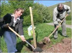 Bürgermeisterin Sigrid Hornauer dankte dem Albverein für seine vielfältigen Initiativen und gerade auch für seine regelmäßig durchgeführten Baumpflanzaktionen. „Unsere Gemeinde, die Bürgerinnen und Bürger und die Kulturlandschaft um Sternenfels und Diefenbach profitieren davon“, sagte sie. Allerhand Wissenswertes hatte die Bürgermeisterin über die Elsbeere, den Baum des Jahres 2011 recherchiert: die Früchte dieses Baumes wurden früher für ihre entgiftende und heilende Wirkung geschätzt. Heute hat die Elsbeere in der Forstwirtschaft wegen seines wetvollen, besonders harten Holzers eine gewisse Bedeutung. „Früher wurde dieses Holz unter anderem für die Herstellung von Rechenschiebern verwendet“, hatte die Bürgermeisterin herausgefunden. „Insofern hat der Baum einen optimalen Standort in der Nähe der ehemaligen Fabrik Schweizer gefunden, die einst ebenfalls Messwerkzeuge herstellte, wenn auch aus Metall“.