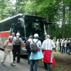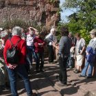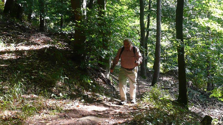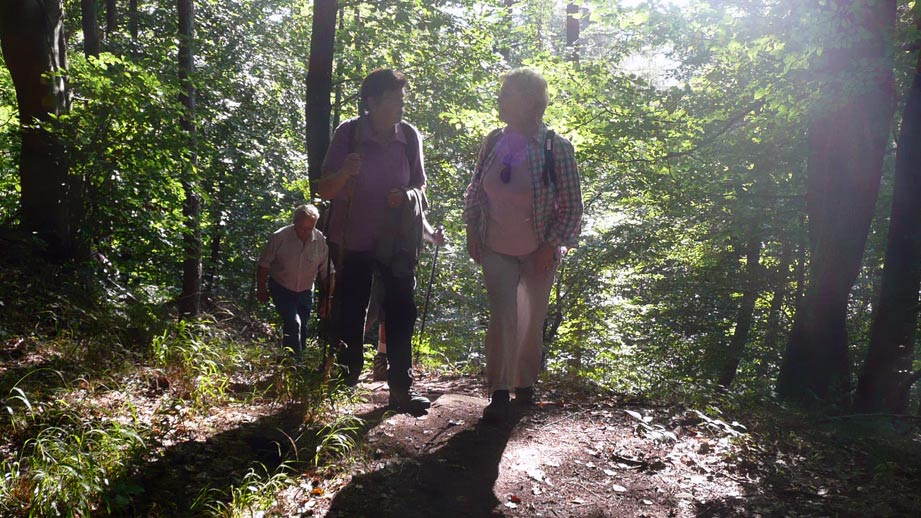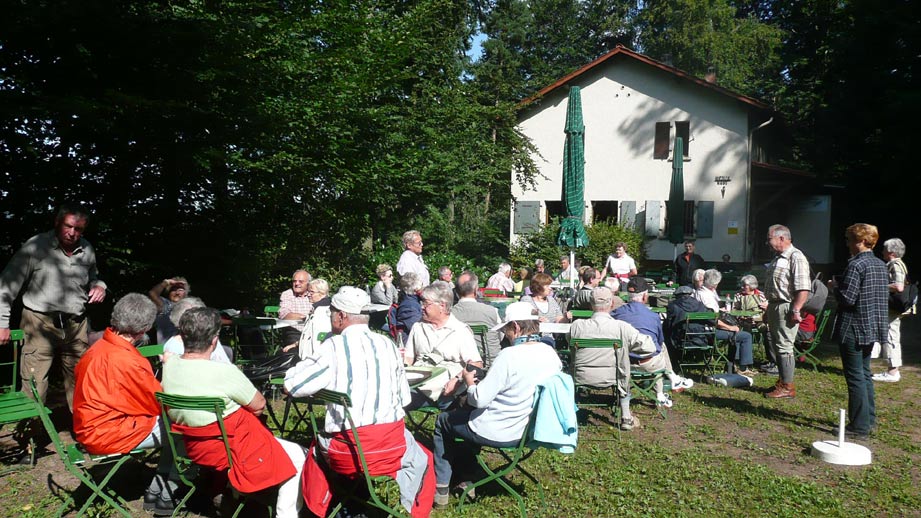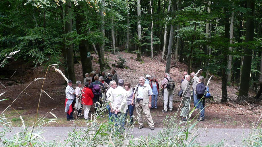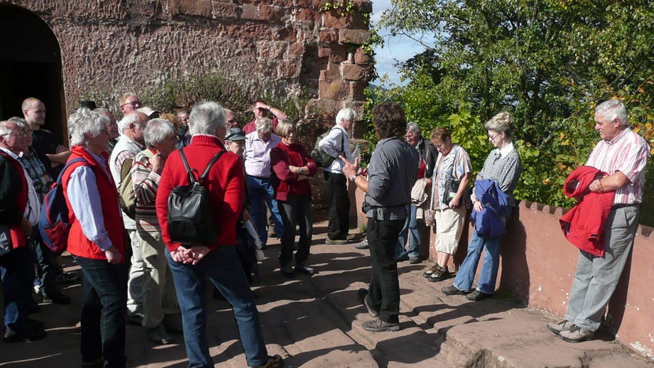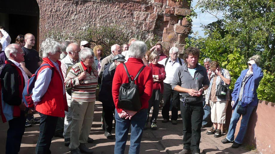 Höchstes Lob wurde den Wanderführern zuteil. Über Bad Bergzabern fuhren die Wanderfreunde mit dem Bus ins Dahner Felsenland. In zwei Gruppen wurde dann auf relativ ebenen Waldwegen zum Hirzeckhaus, einer der vielen Hütten des Pfälzer Waldvereins, gewandert. Von dort aus erreichte eine Gruppe auf teilweise engen Pfaden mit unterschiedlichen An- und Abstiegen den Bethof, wo bereits die zweite Gruppe wartete. Beim gemeinsamen Mittagessen gab’s viel zu erzählen. Danach führte der Weg weiter durch ein Waldstück mit mächtigem Baumbestand, ehe sich der Wanderweg hin zu einem idyllisch gelegenen Tal mit einem kleinen See öffnete. Zur reizvollen Landschaft kam schließlich der Rundgang durch die Ruine Berwartstein, einem Zeugnis eindrucksvoller mittalalterlicher Baukunst. Ein in den Fels hinab getriebener tiefer Brunnen im Innern der Burg versorgte bei einer Belagerung die Eingeschlossenen mit Frischwasser. Vom Turm der Burg aus hatte man einen herrlichen Blick auf die bewaldeten umliegenden Berge. Mächtige Buntsandsteinfelsblöcke überagen an manchen Bergkuppen weithin sichtbar den Wald. Diese sind im Sommer ideale Kletterfelsen für Bergsteiger.