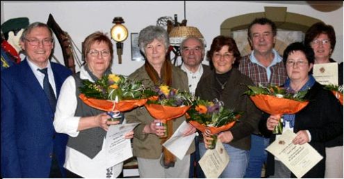 Für 40jährige Mitgliedschaft wurden Heinz Albrecht, Silvia Köhler (nicht auf dem Bild), Martina Kugler, Marianne Müller, Rosemarie Räuchle-Rühle (nicht auf dem Bild) und Karin Vincon geehrt. Eine Auszeichnung für 25jährige Mitgliedschaft ging an Irmtraud Armingeon, Manfred Armingeon, Marcel Armingeon (Fam. Armingeon nicht auf dem Bild), Gerda Haag, Konrad Köhler und Barbara Zink.