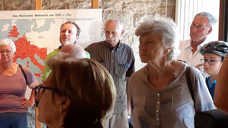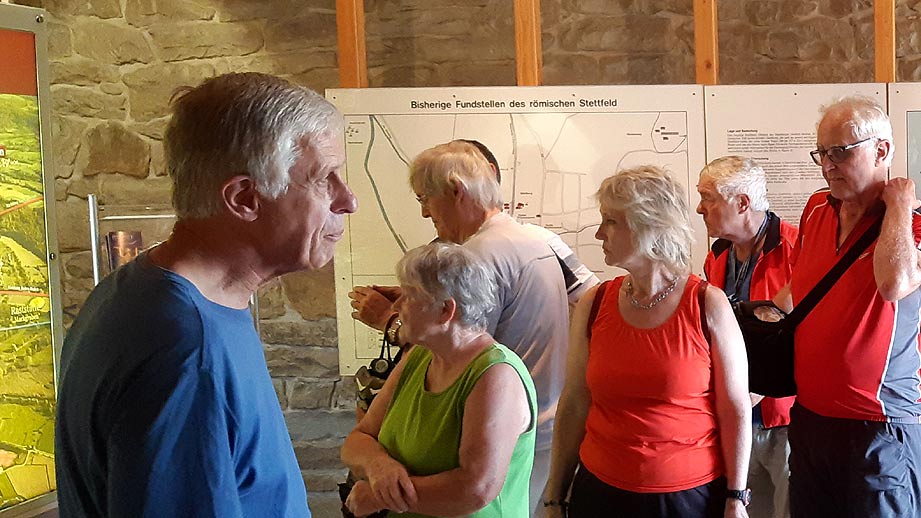 In der Kraichbachniederung, kurz vor Unteröwisheim, waren Storcheneltern mit ihrem Nachwuchs in den Wiesen unterwegs. Das nahegelegene Nest befindet sich auf dem stattlichen Schloss Unteröwisheim. Nach knapp zweieinhalb Stunden trafen wir pünktlich mit dem Zwölfuhrläuten der äußerst sehenswerten Sankt-Marcellus-Kirche in Stettfeld ein. Im ebenfalls sehr sehenswerten und neu eingerichteten Römermuseum war für uns eine Führung gebucht. Herr Dörflinger, einer der ehrenamtlichen Fachleute, nahm uns mit in die spannende Vergangenheit. Viele interessante Informationen bekamen wir sehr kompetent vermittelt. Beeindruckend ist, dass die überwiegende Zahl der Ausstellungsstücke Originale sind, die in Stettfeld gefunden wurden. Stettfeld selbst war in der Römerzeit eine bedeutende Kreuzung zweier Römerstraßen. Von dort aus führte eine der Straßen nach Bad Cannstatt und es ist nicht ausgeschlossen, dass diese Verbindung unter Einbezug des Strombergrückens über Sternenfels verlief, liegt doch der Breite Weg auf einer alten Römerstraße. Gerade die Höhenzüge waren beliebt, vermied man doch so die damals oftmals immer feuchten Täler. Das Museum ist wirklich einen Besuch wert!