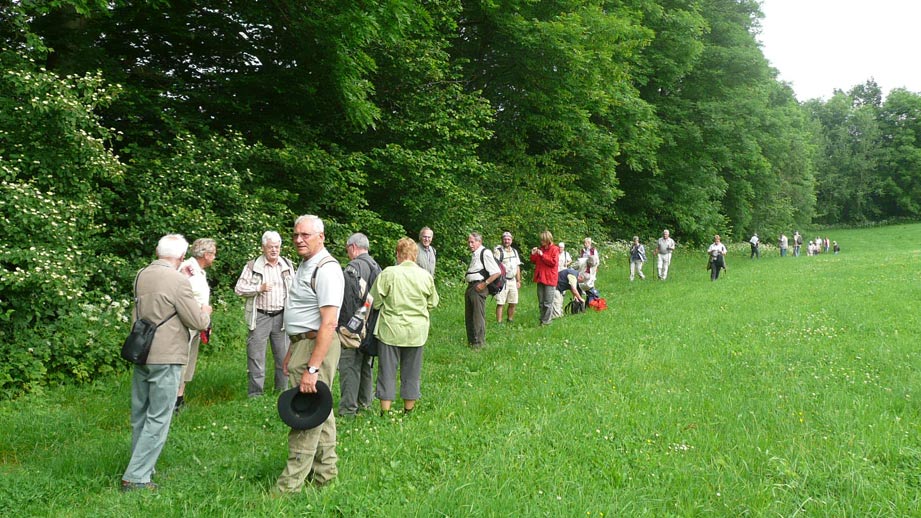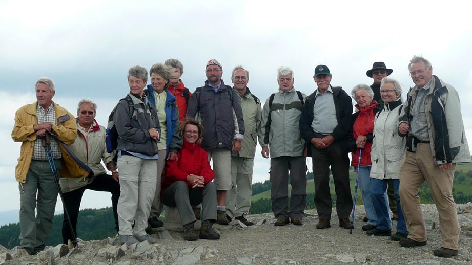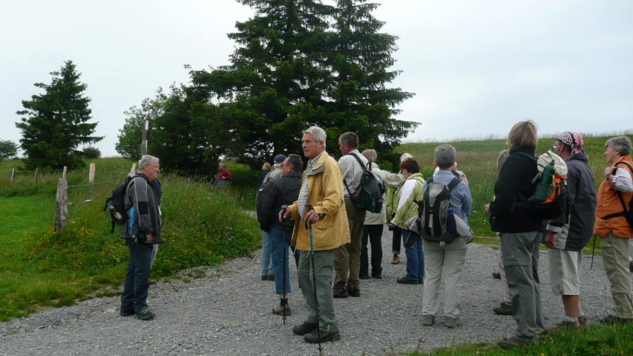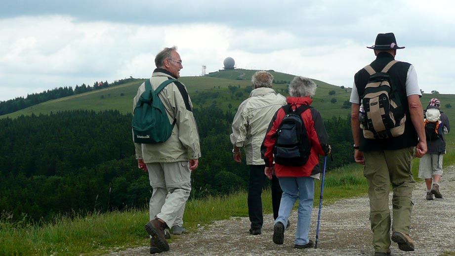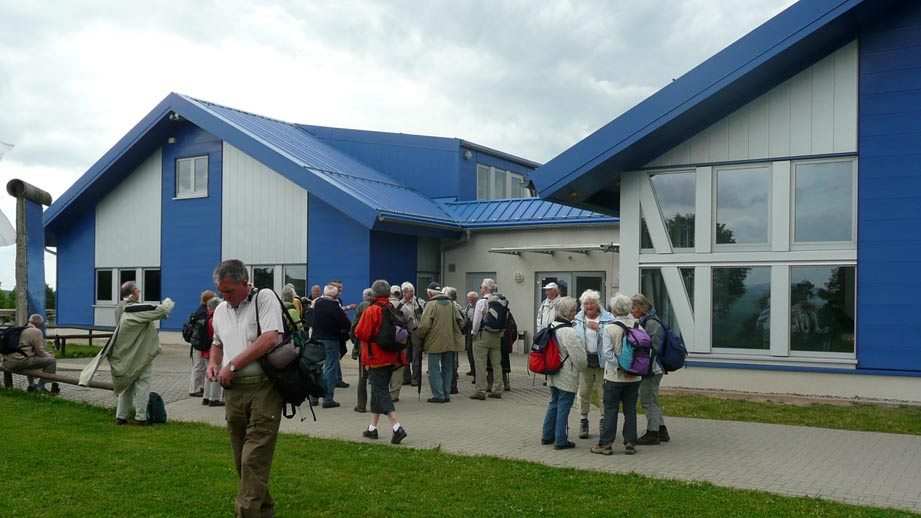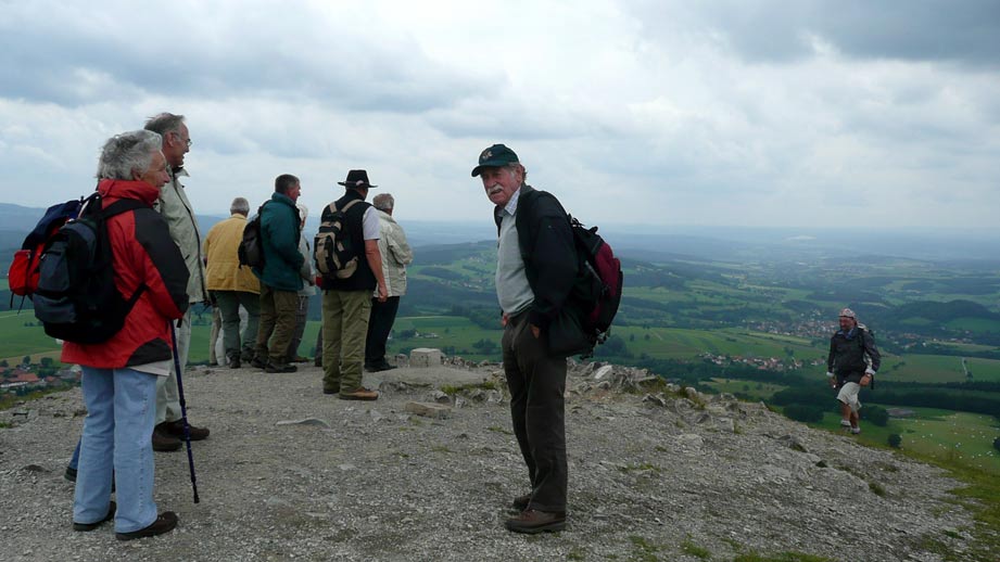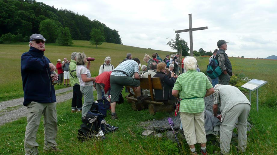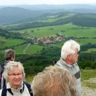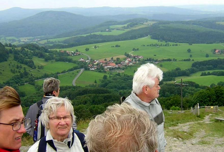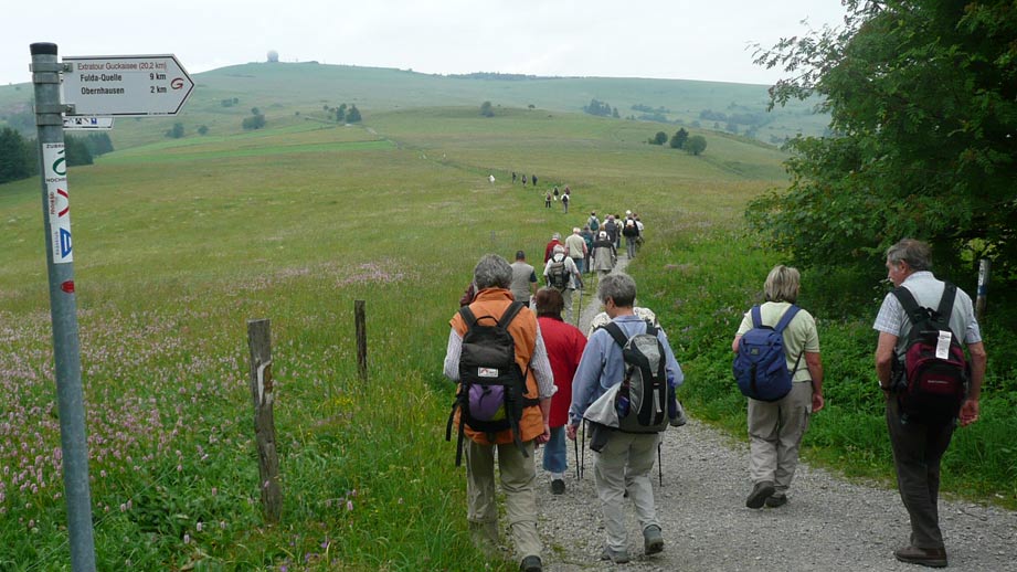 Auf der Hinfahrt gab es in der Bischofs- und Barockstadt Fulda einen größeren Halt für eine geführte Besichtigungstour. Schon bei der ersten Wanderung am nächsten Tag von Hilders aus stellte man erfreut fest, dass es nahezu keine asphaltierten Wanderwege sondern gut gepflegte Erdwege gab. Es ging durch Wald und Wiesen mit einer einmaligen Pracht verschiedenster Wiesenblumen. Die höher gelegenen Almen, so ein Ortskundiger, werden nur einmal im Jahr gemäht, damit die Samen ausreifen können und ausfallen, ehe das Gras für das Heu gemäht wird. Entsprechend gut fällt die Qualität der Milch aus. Am nächten Tag brachte der Bus die Wanderer an den Fuß der Wasserkuppe. Vorbei an der Fuldaquelle ging es bei toller Rundumsicht hinauf zum höchten Berg der Rhön, 950 m über N.N.