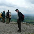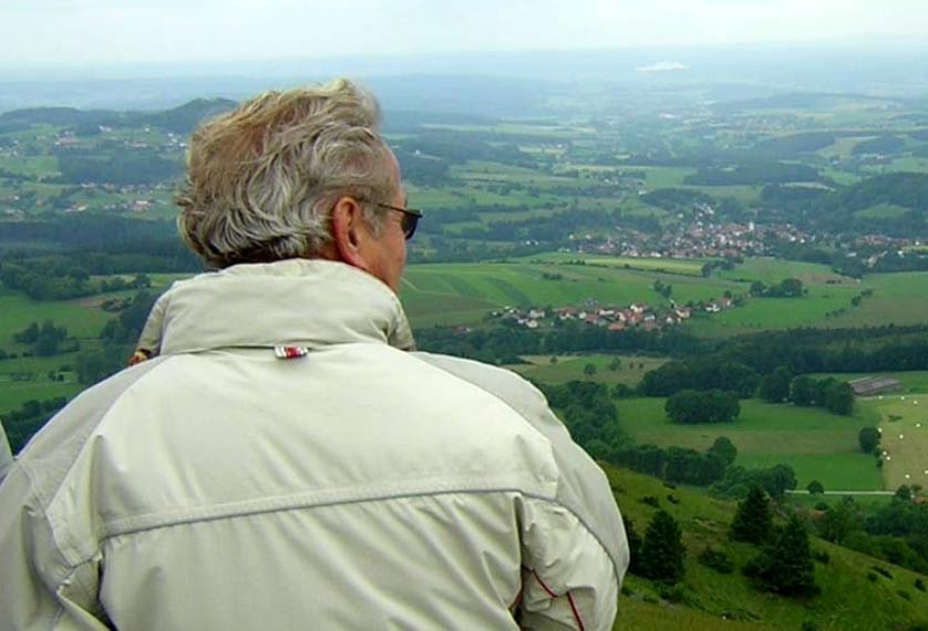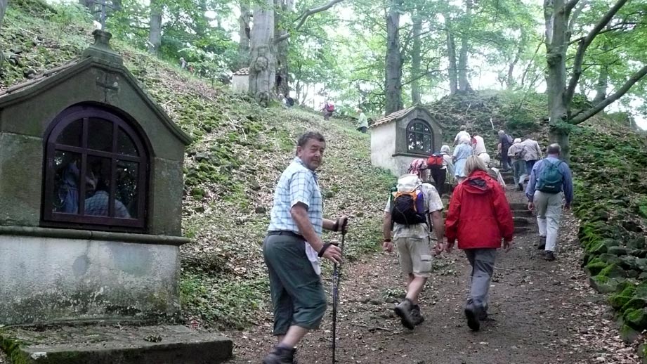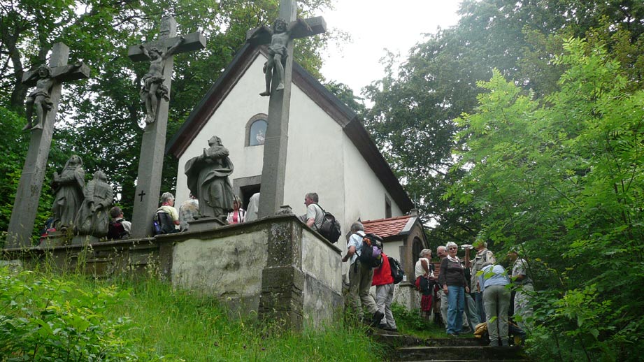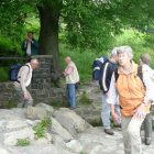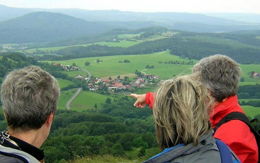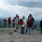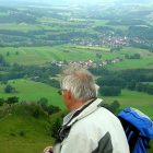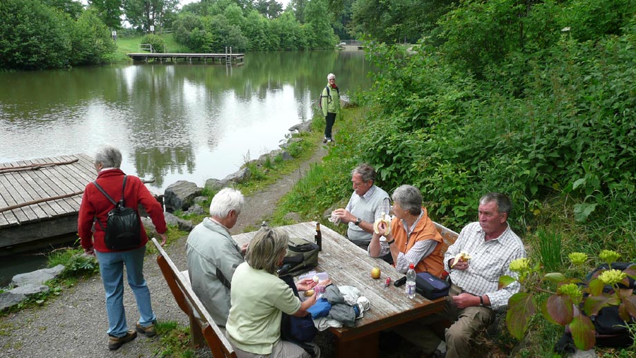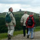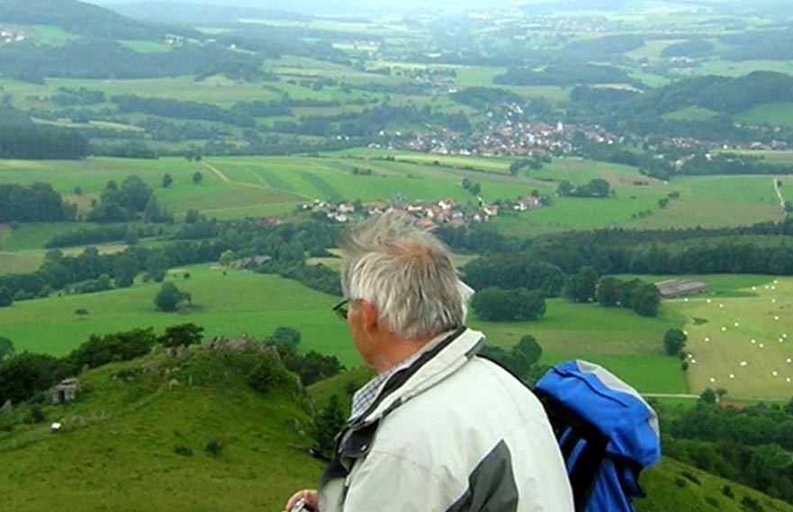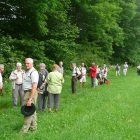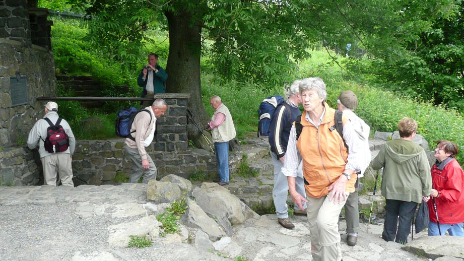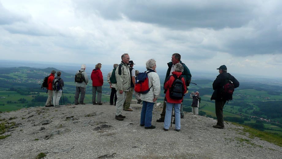 Auf der Hinfahrt gab es in der Bischofs- und Barockstadt Fulda einen größeren Halt für eine geführte Besichtigungstour. Schon bei der ersten Wanderung am nächsten Tag von Hilders aus stellte man erfreut fest, dass es nahezu keine asphaltierten Wanderwege sondern gut gepflegte Erdwege gab. Es ging durch Wald und Wiesen mit einer einmaligen Pracht verschiedenster Wiesenblumen. Die höher gelegenen Almen, so ein Ortskundiger, werden nur einmal im Jahr gemäht, damit die Samen ausreifen können und ausfallen, ehe das Gras für das Heu gemäht wird. Entsprechend gut fällt die Qualität der Milch aus. Am nächten Tag brachte der Bus die Wanderer an den Fuß der Wasserkuppe. Vorbei an der Fuldaquelle ging es bei toller Rundumsicht hinauf zum höchten Berg der Rhön, 950 m über N.N.
