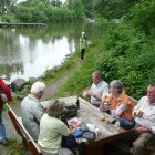 Weiter ist ein Stück Originalgrenzzaun der DDR-Grenze in unmittelbarer Nähe zum ehemaligen amerikanischen Beobachtungspunkt noch erhalten. Damit wird die furchtbare Realität dieser Grenze beispielhaft dokumentiert, aber auch die friedliche Revolution der DDR-Bevölkerung wird aufgezeigt, die zur Wende und schließlich zum wiedervereinigten Deutschland geführt hat. Dass Einheit ganz praktisch demonstriert wird, haben die Wanderfreunde aus dem Schwabenland besonders erlebt. Musiker aus Zella-Mehlis, die schon seit der Wende mit den Sternenfelser Albvereinlern freundschaftlich verbunden sind, ließen es sich nicht nehmen, nach Tann zu fahren, um dort mit Zitter, Gitarre und Handharmonika zu musizieren. Gemeinsam wurde manches Volks- und Heimatlied gesungen. So wurden in ganz besonderer Weise das Miteinander und die Herzlichkeit unterstrichen. Auf der Heimfahrt gab es nochmals eine größere Unterbrechung der Busfahrt, um das Fluidum der Stadt Bamberg, die zum Welt-Kulturerbe erklärt wurde, sowohl kulturell als auch kulinarisch ein wenig zu erkunden. Viel Lob und Beifall ernteten das Ehepaar Rieger für die Reiseleitung, der Busfahrer Gerhard für umsichtiges Fahren. Aber es waren auch die Reiseteilnehmer selbst, die durch Harmonie zum Gelingen der Wanderausfahrt beigetragen haben.